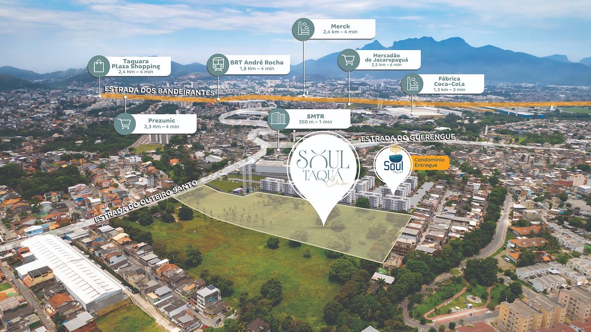 O Soul Taquá Clube está localizado na Taquara, um dos bairros mais tradicionais da zona oeste do Rio de Janeiro. A região conta com fácil acesso a vias importantes, como a TransOlímpica e a Estrada dos Bandeirantes, além de estar próxima ao BRT Taquara e ao BRT Outeiro Santo, o que garante mais mobilidade no dia a dia. Nas redondezas, você encontra tudo o que precisa: supermercados como Prezunic e Supermarket, shoppings como o Taquara Plaza e o Shopping ParkJacarepaguá, além de hospitais, escolas, centros comerciais e polos gastronômicos.