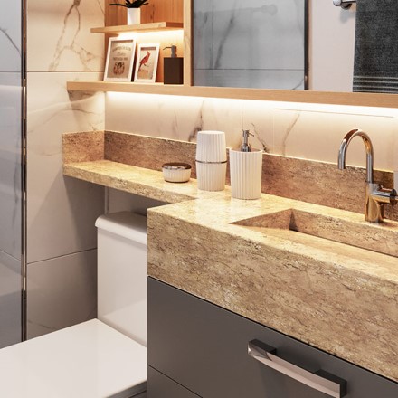 Sabonetes verdes ou vermelhos de bancada com detalhes dourados completam o cenário de maneira delicada e surpreendem suas visitas com um toque especial.